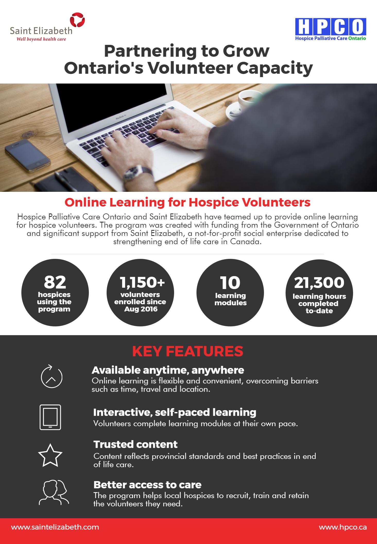 - Bringing online training to local volunteers: After only nine months, this program is already supporting more than 1,150 volunteers at 82 hospices across the province. View infographic.